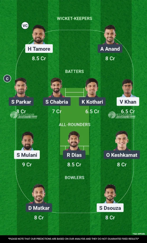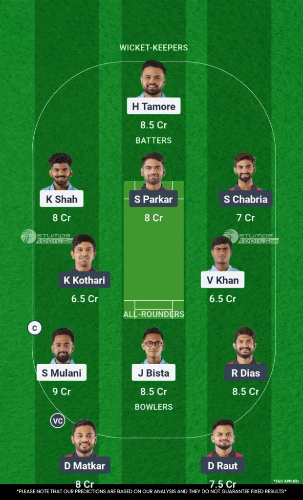 Suved Parkar, Vikrant Auti, Akash Anand(w/c), Adeeb Usmani, Shyamsundar Keshkamat, Dhrumil Matkar, Sagarr Chhabriaa, Dhanit Raut, Karsh Kothari, Parth Ankolekar, Royston Dias
