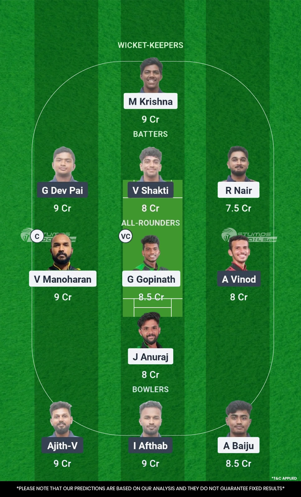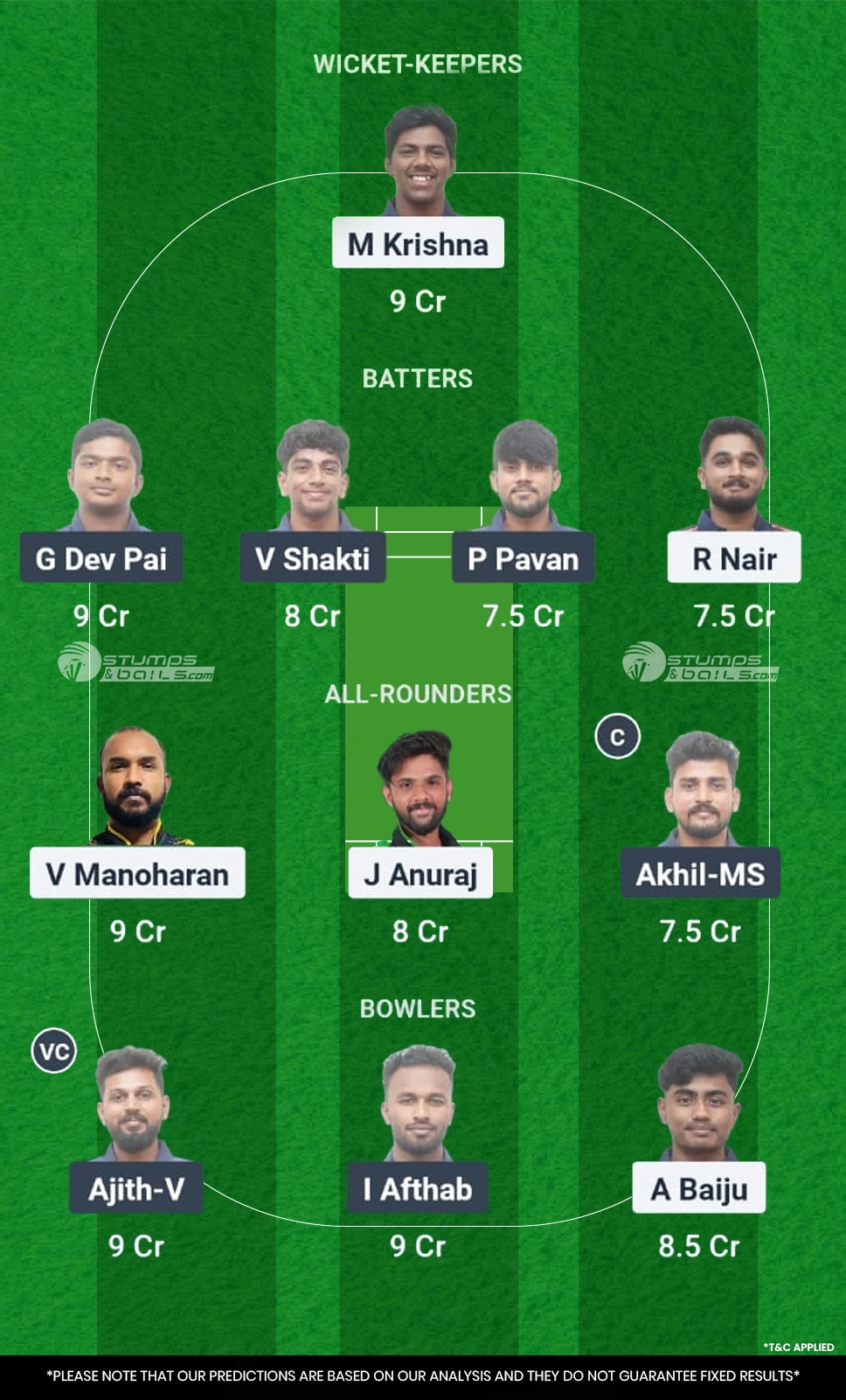 Rohan Nair, Neel Sunny, Manav Krishna (WK), Ahamed Imran, Vinoop Manoharan, Ameersha SN, Mohit Shibhu, Gokul Gopinath, Aadithya Baiju, JS Anuraj, Abi Biju