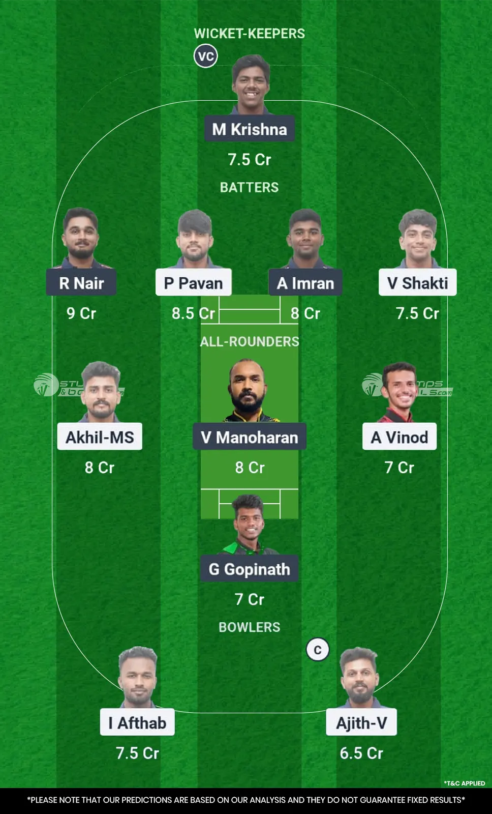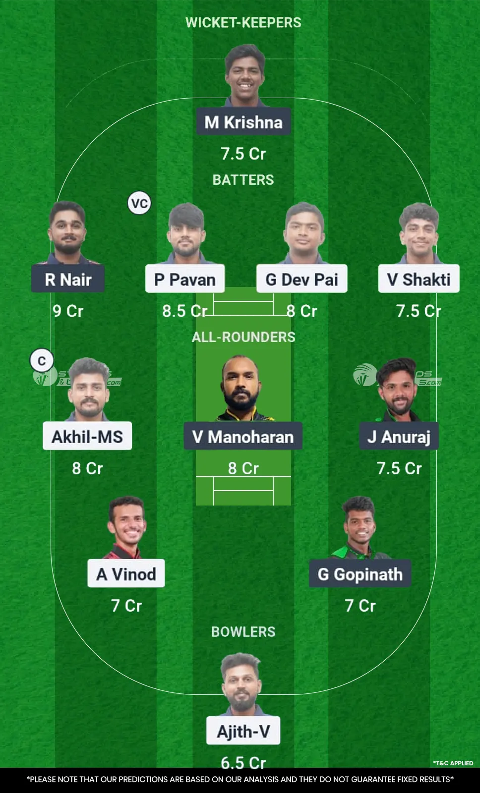 Rohan Nair, Neel Sunny, Manav Krishna (WK), Ahamed Imran, Vinoop Manoharan, Gokul Gopinath, Aadithya Baiju, Ameersha SN, Mohit Shibhu, JS Anuraj, Abi Biju