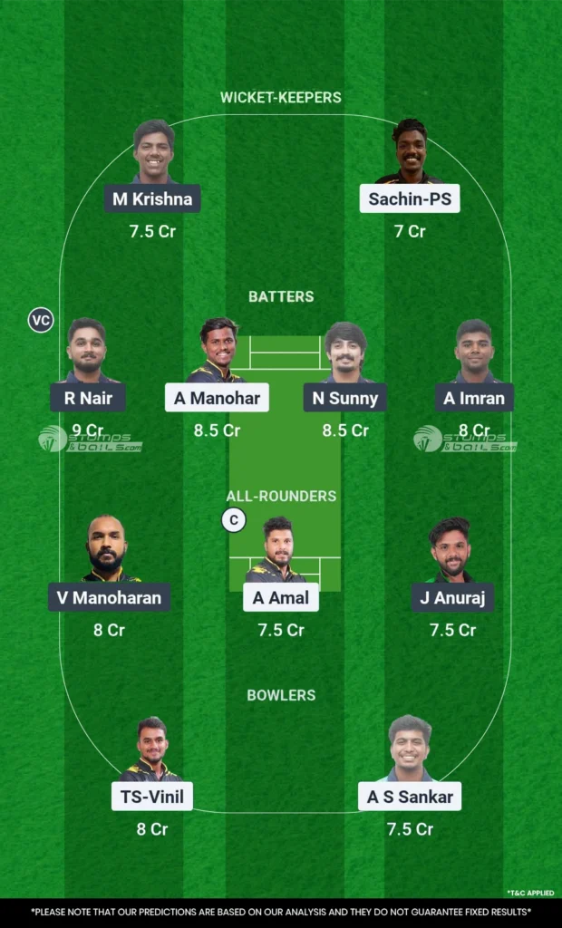 Manav Krishna (wk), Abi Biju, Rohan Nair, Neel Sunny, Ahamed Imran (c), Ameersha SN, Vinoop Manoharan, Aadithya Baiju, Mohit Shibhu, JS Anuraj, Gokul Gopinath