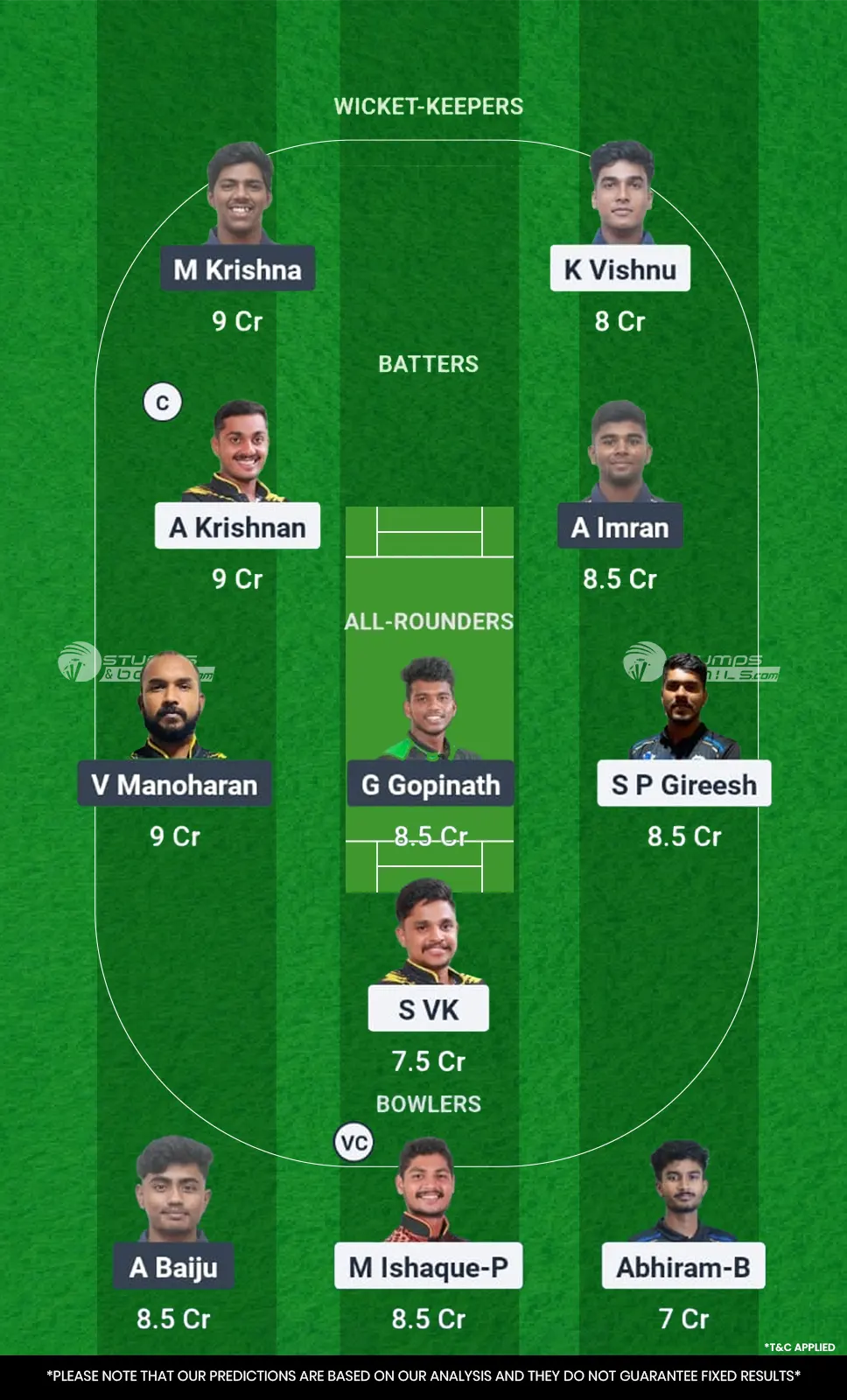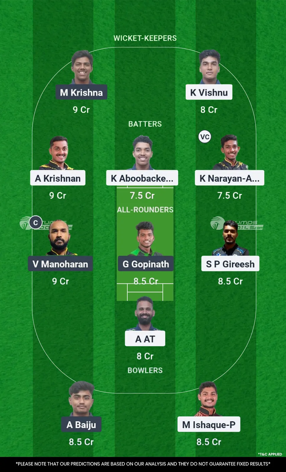 Rohan Nair, Neel Sunny, Manav Krishna (WK), Ahamed Imran, Vinoop Manoharan, Ameersha SN, Mohit Shibhu, Gokul Gopinath, Aadithya Baiju, JS Anuraj, Abi Biju