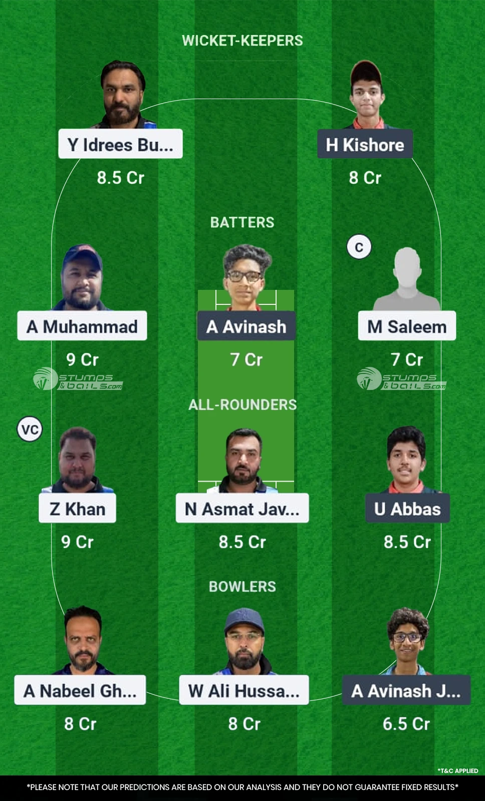 - Bowlers: W Ali Hussain, A Nabeel, A Avinash