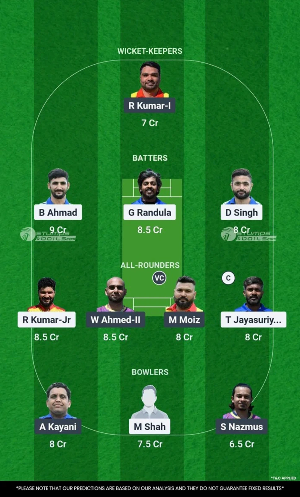 For Grand League fantasy contests, consider picking Rajesh Kumar or Muhammad Moiz as captain. Both are capable of contributing in multiple departments, increasing their fantasy point ceiling. Also, pick Thilina Jayasuriya and Ali Hussain as potential value picks, under-the-radar players who could grab crucial wickets or score quick runs.