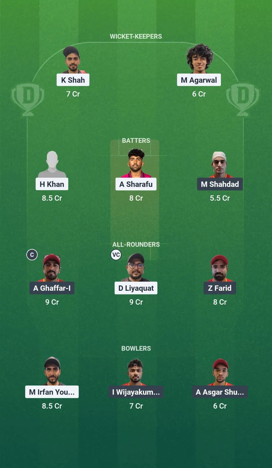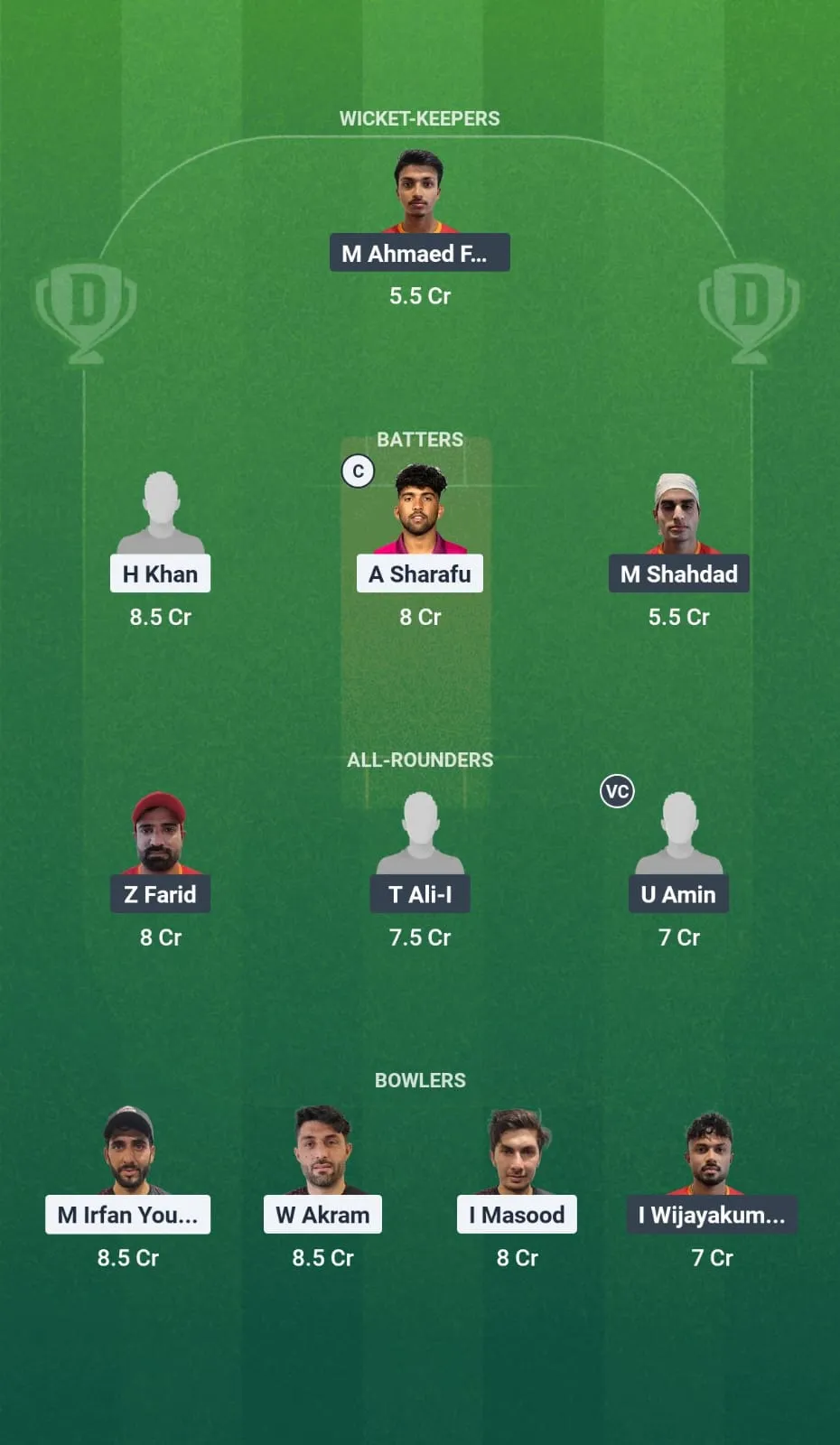 Muhammad Shahdad-I, Mohmmed Ahmaed Fahad Usman, Zawar Farid, Abdul Ghaffar-I, Zainullah Asmatullah-Khan, Mohammed Faraazuddin, Usaid Amin, Taimoor Ali-I, Rayan Khan, Arsalan Ahmad, Ali Asgar Shums