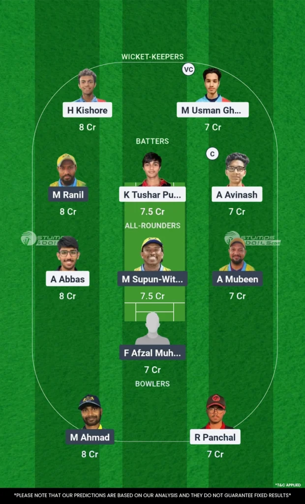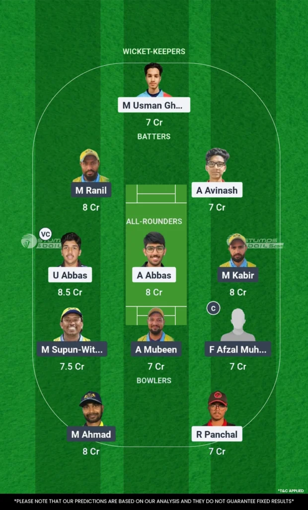 Arpeet Avinash (C), Kandarp Tushar, Ali Abbas, Het Kishore, Ummer Abbas, Asmeet Avinash, Mohammed Usman Ghani (WK), Pradyot Giri, Rudransh Panchal, Rayan Aiden, Jude Saldanha