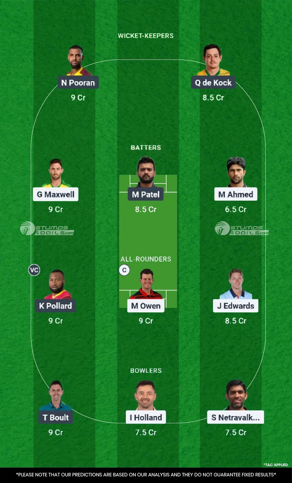 Heath Richards, Nicholas Pooran, Sharad Lumba, Tajinder Singh, Delano Potgieter, Monank Patel, Fabian Allen, Kunwarjeet Singh, Sunny Patel, Nosthush Kenjige, Tristan Luus
