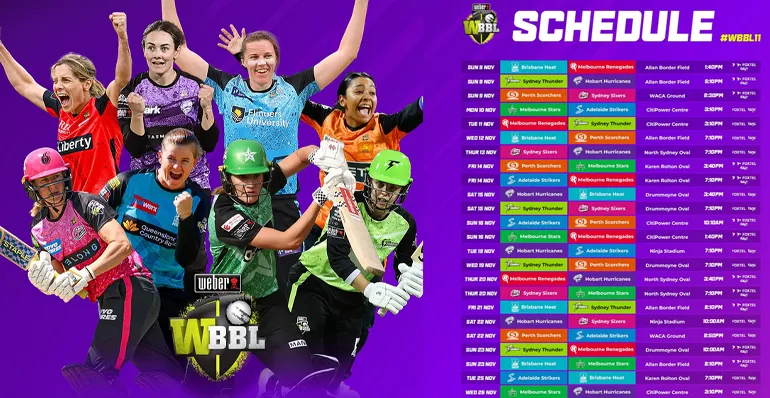 The Women’s Big Bash League (WBBL) 2025–26 season, also known as WBBL|11, promises an action-packed month of top-tier women’s T20 cricket. Cricket Australia has officially announced the WBBL 2025-26 Schedule, featuring eight teams competing across 43 matches from 9 November 2025 to 13 December 2025. Fans can look forward to exciting encounters across major Australian venues, including Adelaide, Melbourne, Sydney, Brisbane, Perth, and Hobart.